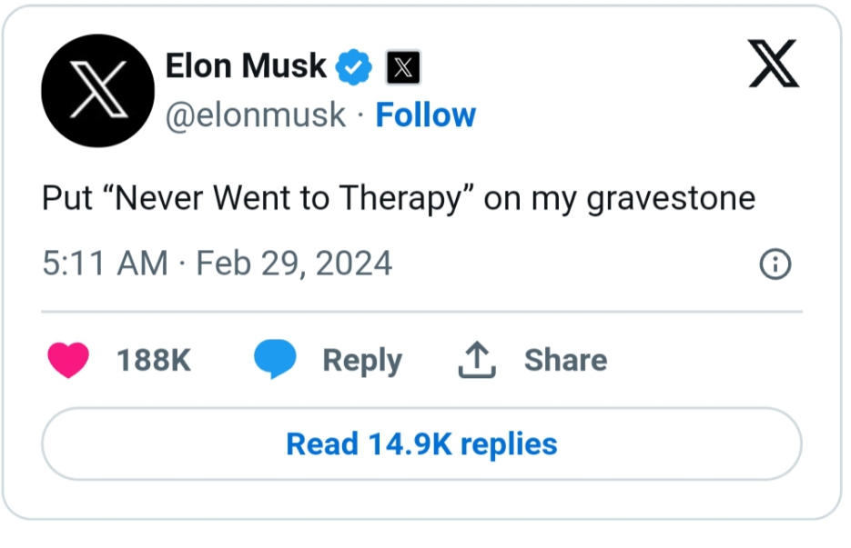 According to Musk via his X account, he has never gone to see a therapist and wants it to be engraved on his gravestone.